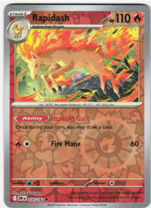 This card is an uncommon Pokémon Trading Card Game collectible featuring the character Rapidash with 110 HP. Illustrated by Sie Nanahara, this Stage 1 Pokémon card is in English and has a regular finish. Manufactured by The Pokémon Company, this card is part of the Pokémon TCG and is numbered 030/182. Perfect for collectors and players alike, this card showcases the iconic Rapidash in a coveted set.
