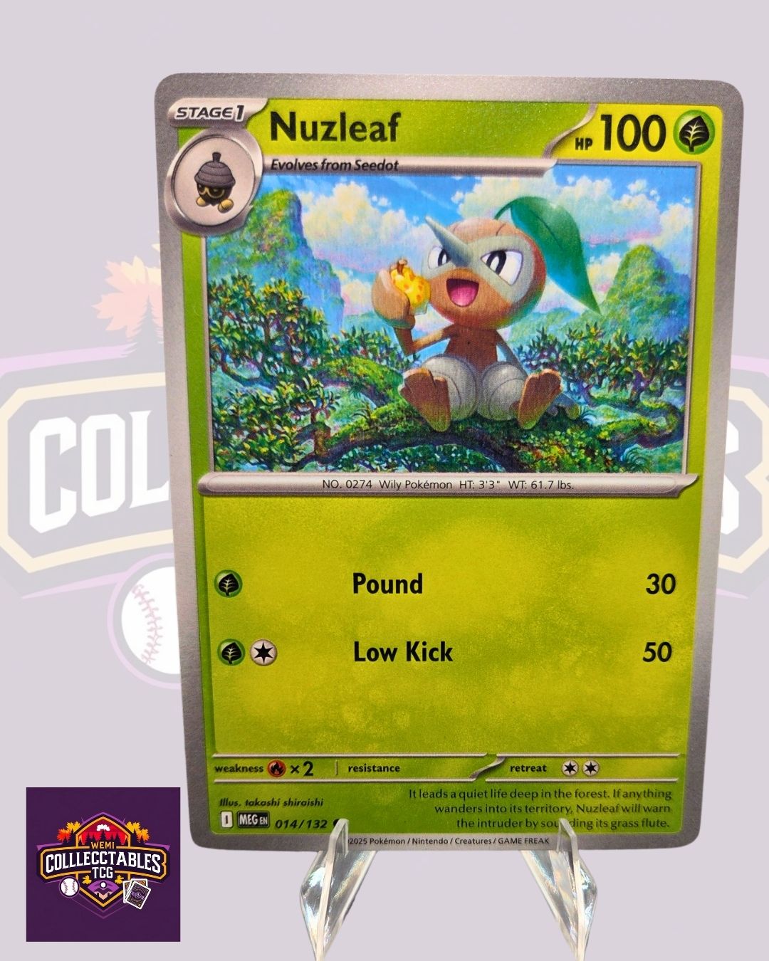 The Nuzleaf card from the English Mega Evolutions Pokémon TCG set features stunning artwork and collectible power. Perfect for collectors and players alike, this card represents the iconic Mega Evolution era — known for its bold designs and dynamic battle strength. Add this officially licensed Pokémon card to your collection to showcase your love for classic Mega Evolutions.