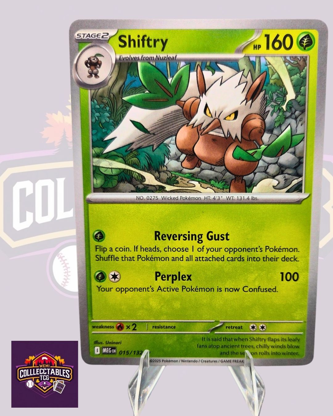The Shiftry card from the English Mega Evolutions Pokémon TCG set features stunning artwork and collectible power. Perfect for collectors and players alike, this card represents the iconic Mega Evolution era — known for its bold designs and dynamic battle strength. Add this officially licensed Pokémon card to your collection to showcase your love for classic Mega Evolutions.
